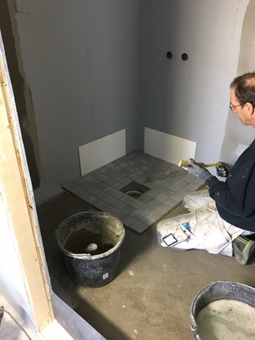 Her har vi festet takskinnen og bunnskinnen. Bunnskinnen er bare limt fast med silikon. Vi har satt på en dør og plassert en bøtte sparkel og en eske flis for å få trykk på skinnen mens den limes.